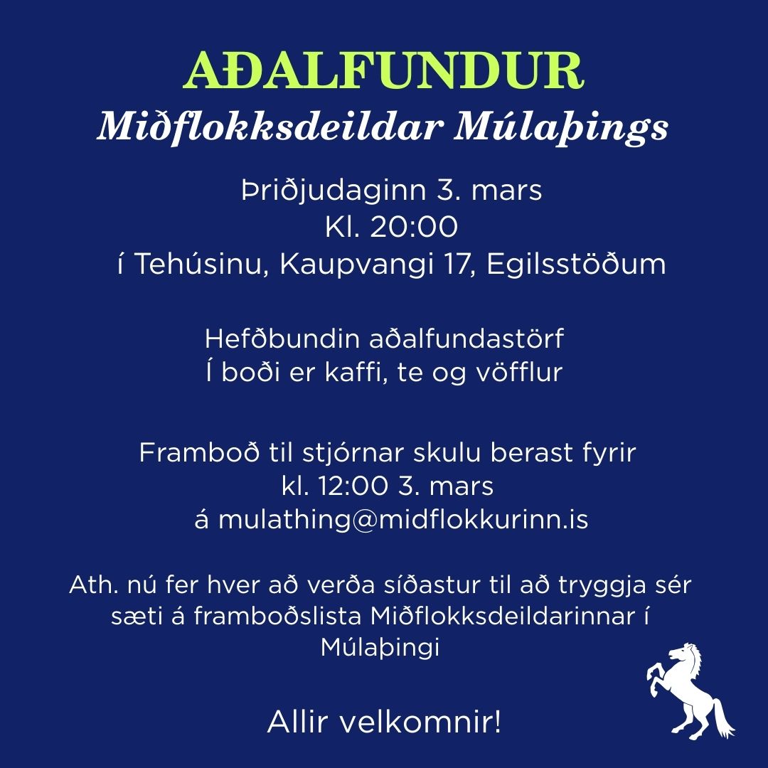 Aðalfundur Miðflokksdeildar Fjarðabyggðar verður haldinn fimmtudaginn 5. mars 2026 Kl. 20:00 í Þórðarbúð, Reyðarfirði Dagskrá: Venjuleg aðalfundarstörf Komandi sveitarstjórnarkosningar Hægt er að skrá sig í Miðflokkinn á heimasíðu flokksins: midflokkurinn.is og verða íbúar Fjarðabyggðar sem það gera, samhliða skráðir í miðflokksdeildina í Fjarðabyggð og eiga þá setu-og atkvæðarétt á aðalfundi Stjórnin |