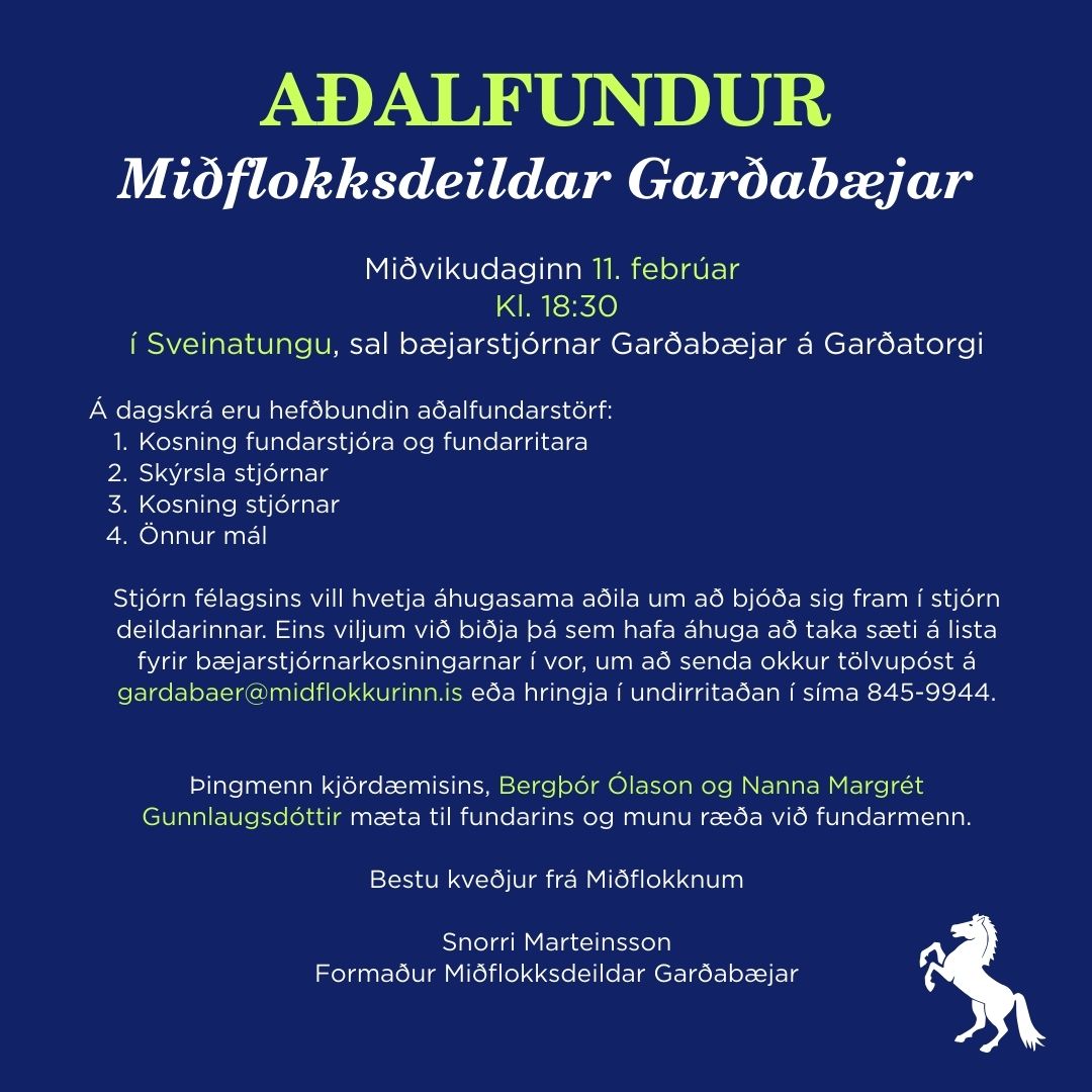 Aðalfundur Miðflokksdeildar Garðabæjar verður haldinn miðvikudaginn 11. febrúar 2026 kl. 18.30 í Sveinatungu, sal bæjarstjórnar Garðabæjar á Garðatorgi.