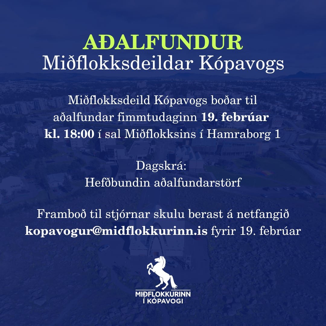 Framboð til stjórnar skulu berast á netfangið kopavogur@midflokkurinn.is fyrir 19. febrúar