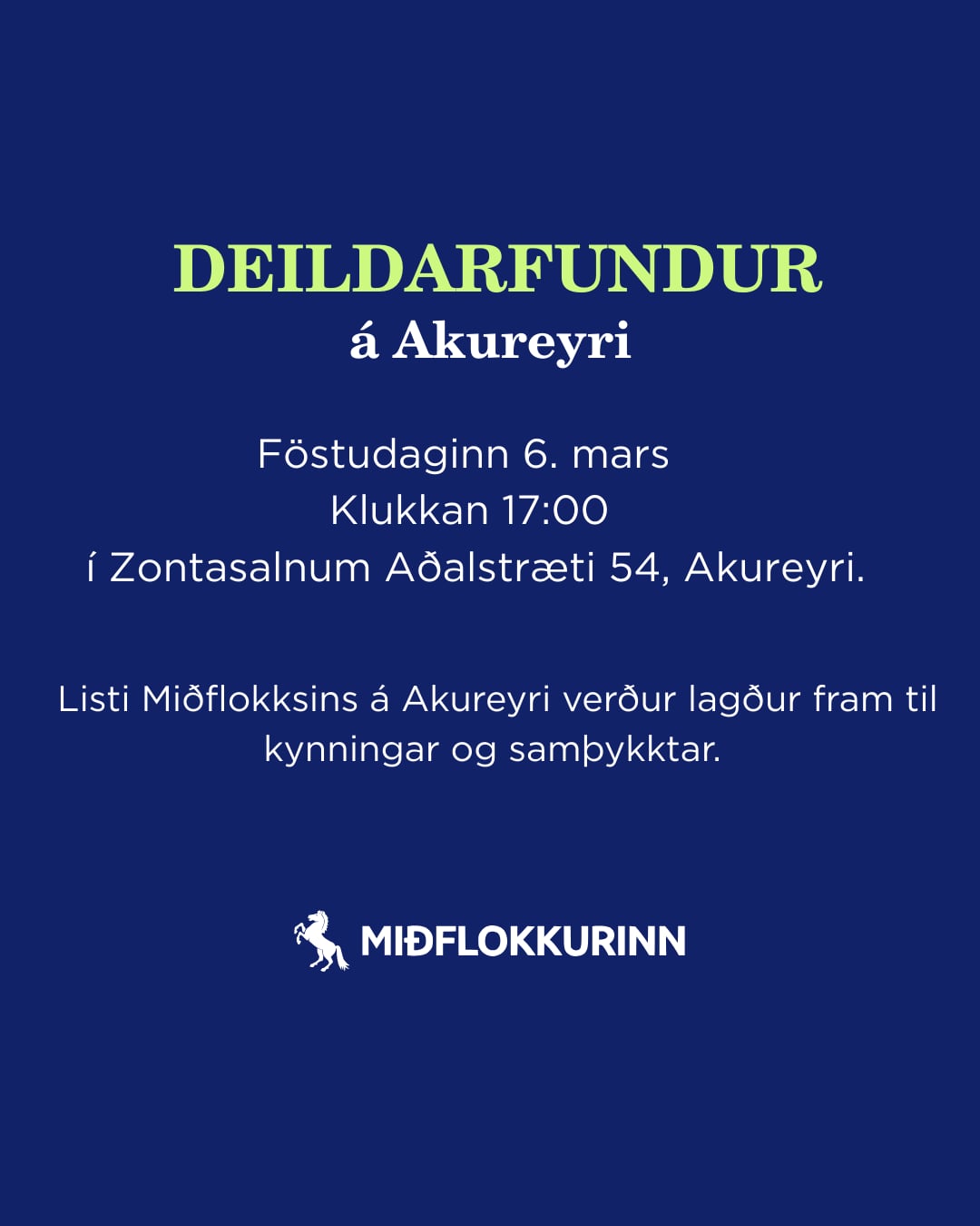 Fundur í Miðflokksdeild Akureyrar verður haldinn föstudaginn 6. mars nk. kl. 17.00 í Zontasalnum Aðalstræti 54, Akureyri.